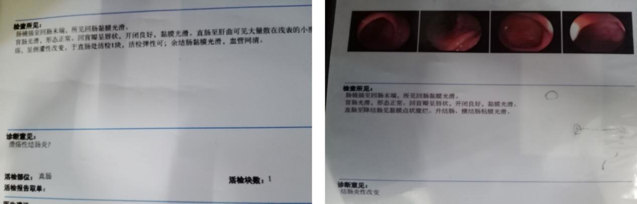 尝试主任的方法半个疗程,肠鸣没有了,腹痛从剧烈疼痛变成隐隐痛,便血量慢慢减少。又接着治疗1个疗程后,腹痛、肠鸣没有了,拉脓血便的次数逐渐减少到2次,精神头比之前好多了,吃饭有食欲了。差不多治疗了3个疗程,脓血便消失,不适症状都没有了,复查肠镜显示:全结肠及末端未见明显异常。